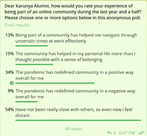 Karunya – The Missing Link (https://t.me/readthemissinglink) is Karunya’s alumni telegram group of alumni. The following polls were conducted, a cross section of the group responded and their views are captured here. Every Karunya alumni is encouraged to join and participate in the group.